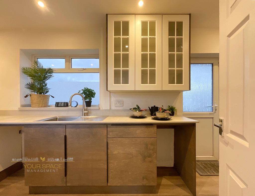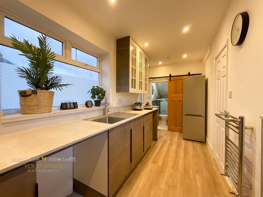 At the rear, the well-appointed kitchen enjoys a practical layout, with ample light wood cabinetry, stone-effect worktops, stainless steel sink, integrated oven, and gas hob—ideal for home cooks and busy households alike. There is direct access out to the rear decking and garden, linking inside and outside living seamlessly.
