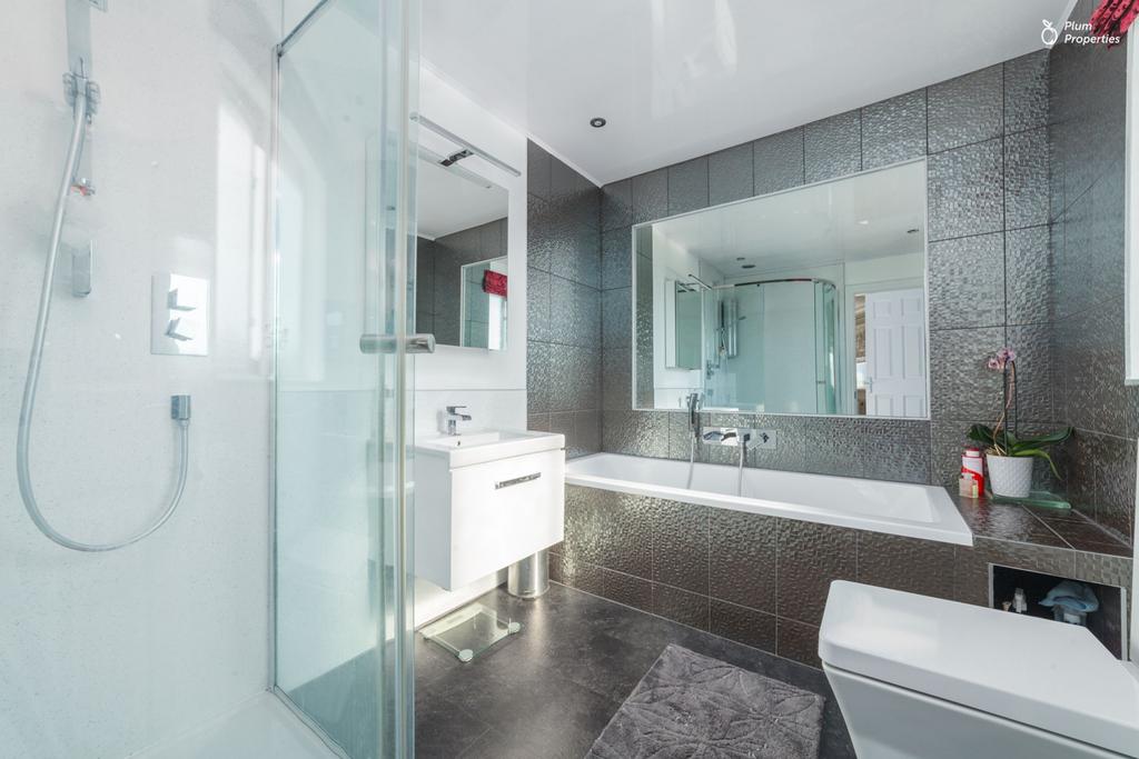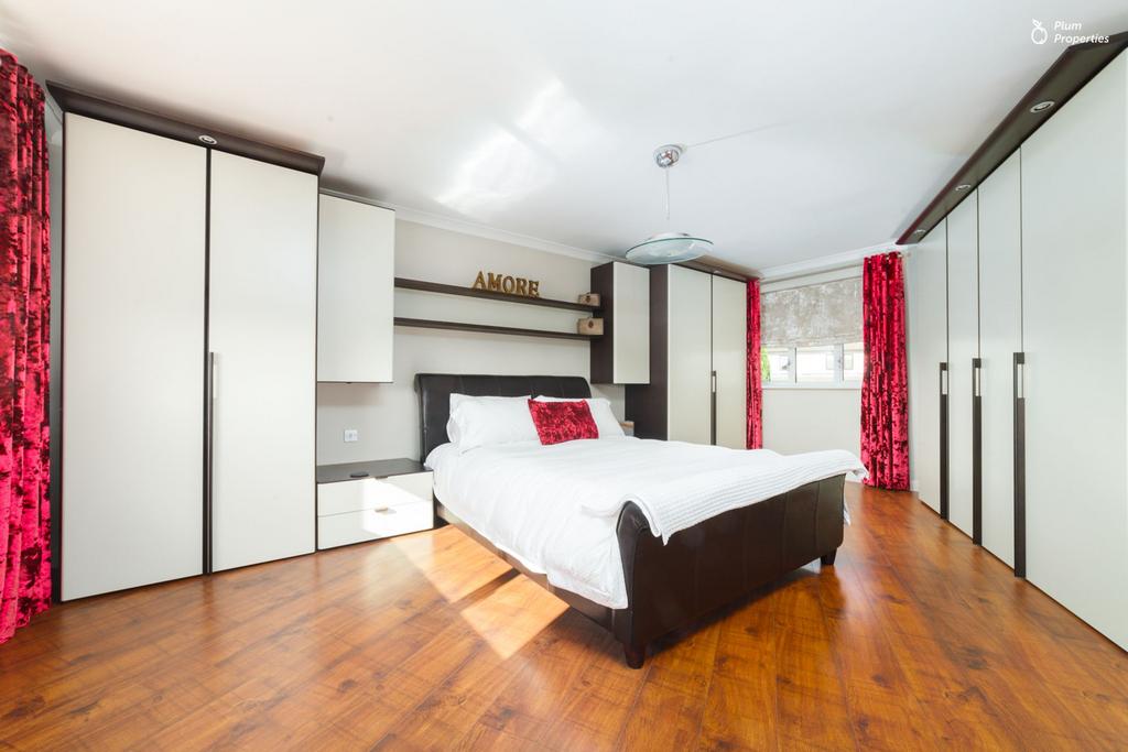 Stairs lead to the upper floor that comprises five large bedrooms and a luxurious family bathroom. The master bedroom includes Pergo flooring and has a substantial range of Haus-fitted bedroom furniture and wardrobes and runs the full depth of the property, therefore benefitting from dual aspects to front and rear. A spacious and beautifully-presented four-piece en suite bathroom is a real sanctuary and incorporates a large bath with wall-mounted taps, corner shower cubicle, generous wash basin and WC. A recently fitted stylish family bathroom has a contemporary look and feel throughout with white brick effect wall tiling and striking flooring. The family bathroom is home to a range of luxurious fittings including a roll top bath, walk-in shower, wash basin and WC and is complemented with under-floor heating.