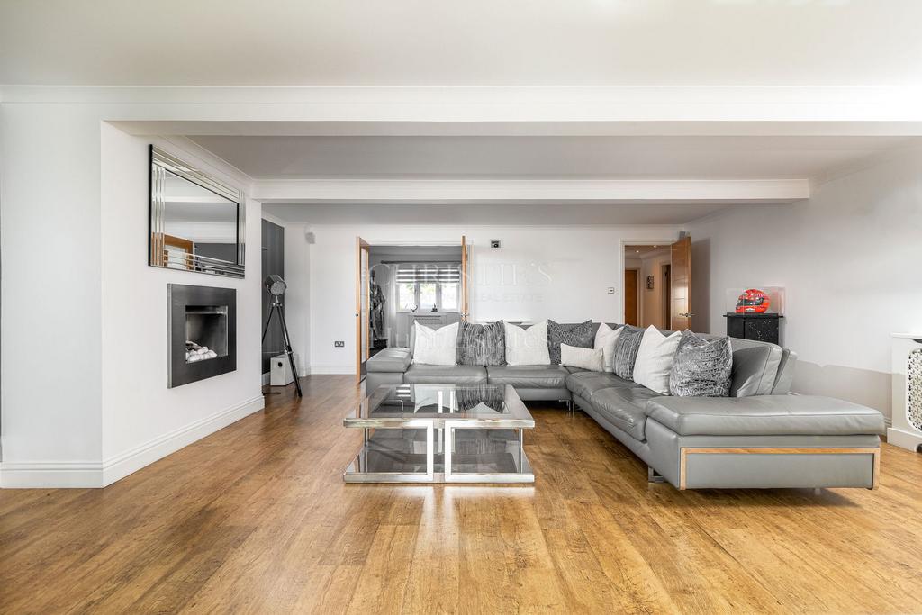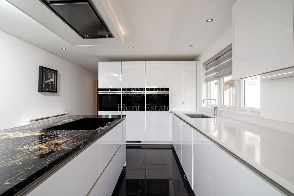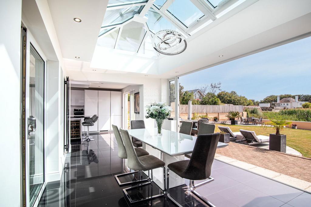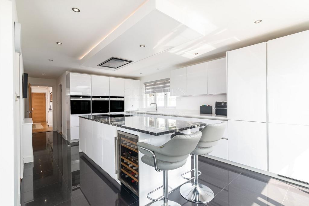 A sliding entrance gate opens to a large, paved parking area. The tasteful design ensures a light airy feel throughout. The kitchen is a wonderful area for friends and family to socialise. There are quality Schmidt units with centre island and granite work tops which give a sleek finish. It is open-plan to the dining room, which the current owners extended, with lantern roof and bi-fold doors to the sun terrace and lawned garden. The separate sitting room is fitted with black-out blinds and a ceiling projector to create a home-cinema, There are two further reception rooms allowing space for the whole family to relax for their individual needs and hobbies. There is a spacious utility room.