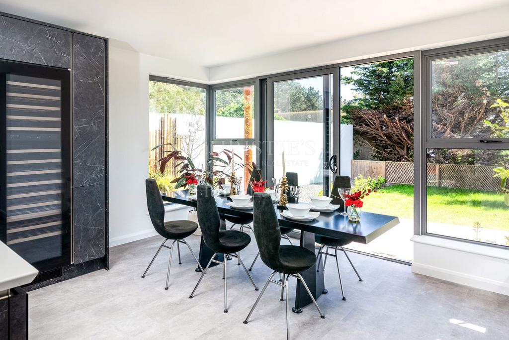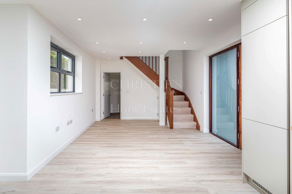 Comprising; double height entrance hall with bespoke wood and glass staircase and a striking modern light installation, cloakroom and coats storage. The sitting room is 31.4 ft in length with a feature fire and doors to the terrace, the kitchen leads seamlessly on; being 31 ft in length and equipped with all the modern appliances including a large and practical island. There is also a designed area for a dining table with access to the terrace and some sea views. A snug/study with a sea view provides an additional reception room.