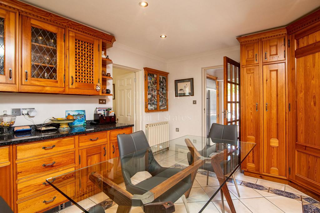Comprising; entrance hall, cloakroom, 21 ft. drawing room stretching the full width of the house and with doors to both the patio and swimming pool. It also has a real fire. There is a sitting room/snug which could also double as an extra guest room if needed. The dining room, in turn, leads to the kitchen for ease of entertaining. The kitchen is fitted with units on 4 sides; it has granite work surfaces and provides good storage space. There is space for a 6-seater breakfast table. Off the kitchen, a door leads to the rear entrance lobby; there is a coat hanging area, a very useful walk in 'cold' store and utility room, and a door to the car parking area. It is a practical area in which to arrive with the weekly shop or after a long walk with children or pets.