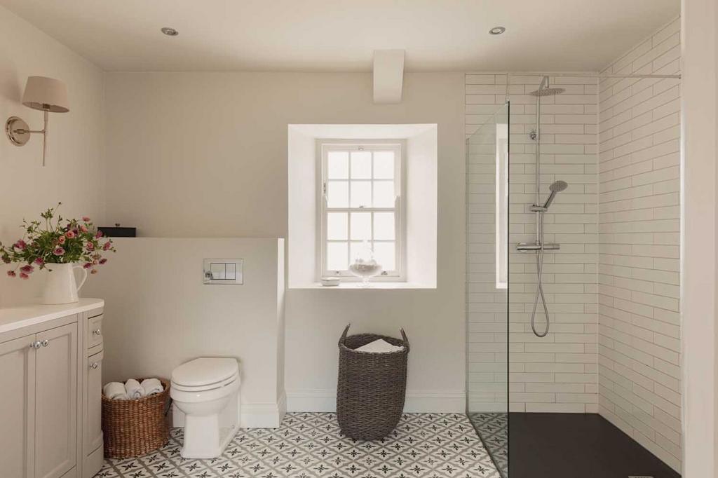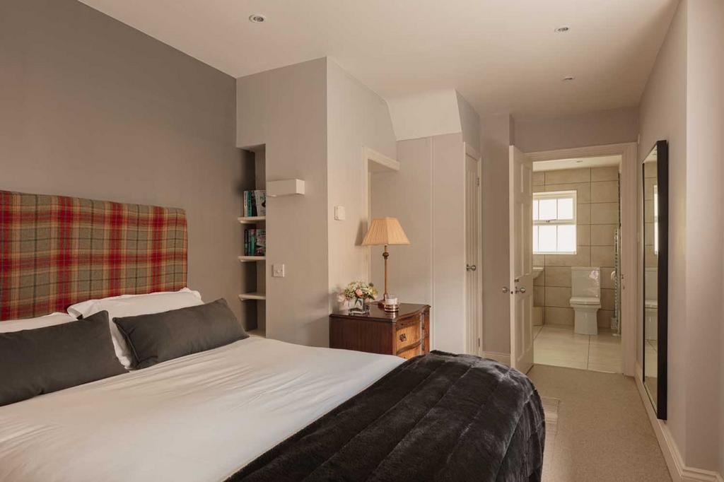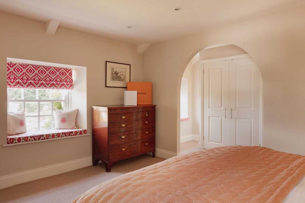 The first floor comprises a principal suite to the left, with dual aspect windows framing views over the gardens and surrounding countryside. This suite is complemented by a private shower room and a dedicated dressing room. To the right are three further bedrooms, one of which includes fully fitted wardrobes creating a dressing area. These rooms are served by a family bathroom with a freestanding tub and a separate shower room, both appointed with quality fixtures and finishes. The interiors remain harmonious throughout, with subtle period features and a thoughtful decorative palette reinforcing the home’s character.