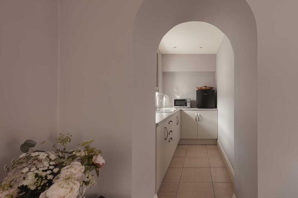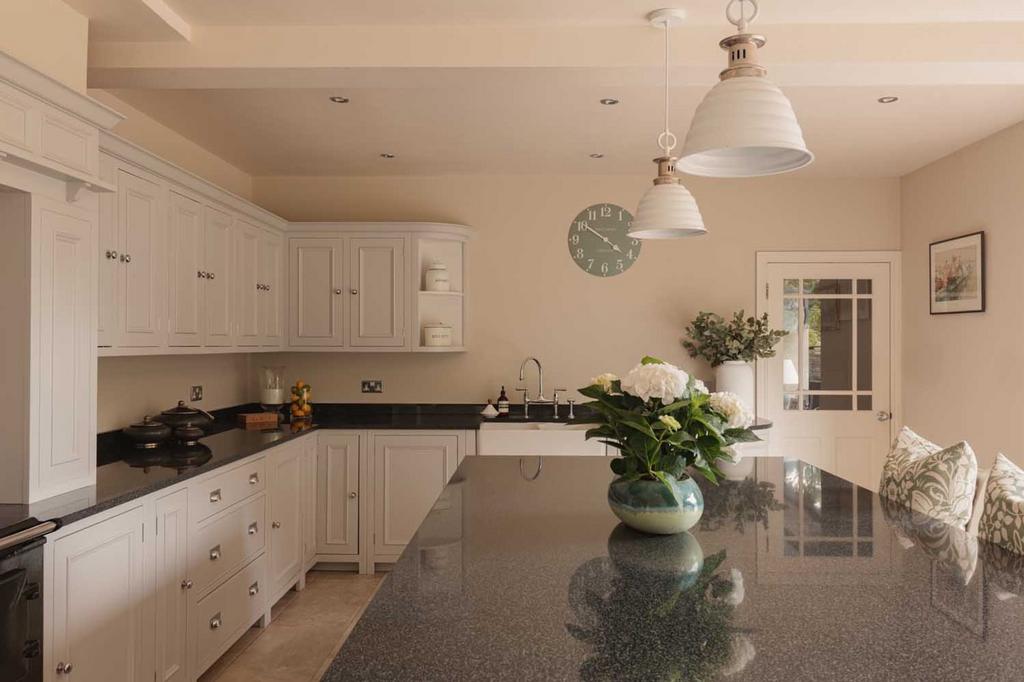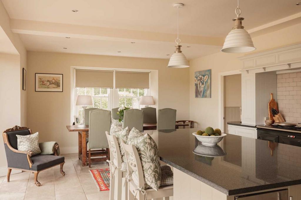 Internally, the house unfolds with quiet sophistication. The entrance hall offers a warm and practical welcome, with boot room and utility areas positioned discreetly to one side. Beyond, the principal kitchen and dining room is arranged to take full advantage of the surrounding gardens, with wide bifolding doors opening directly onto a stone terrace. Bespoke Neptune cabinetry, granite worktops and a central island frame the space, with an electric AGA and Rangemaster wine fridge integrated into the traditional layout. There is ample room for both formal and informal seating, creating a sociable and light-filled setting that connects beautifully with the outdoor spaces.
