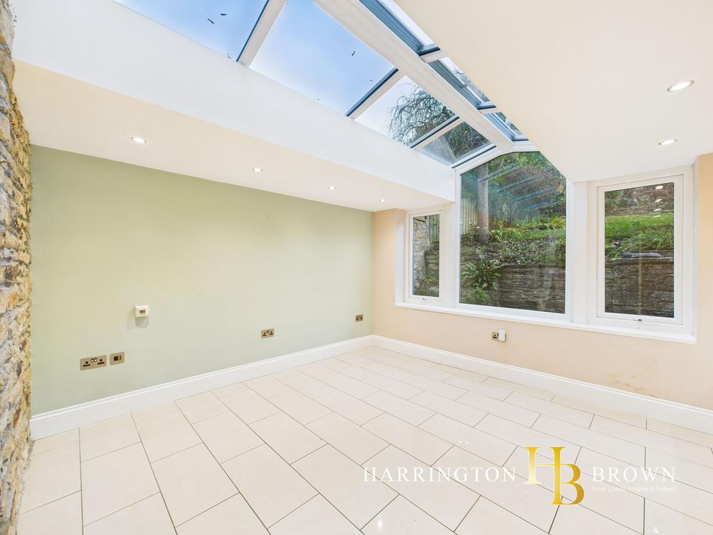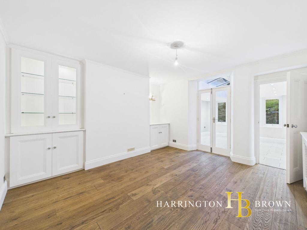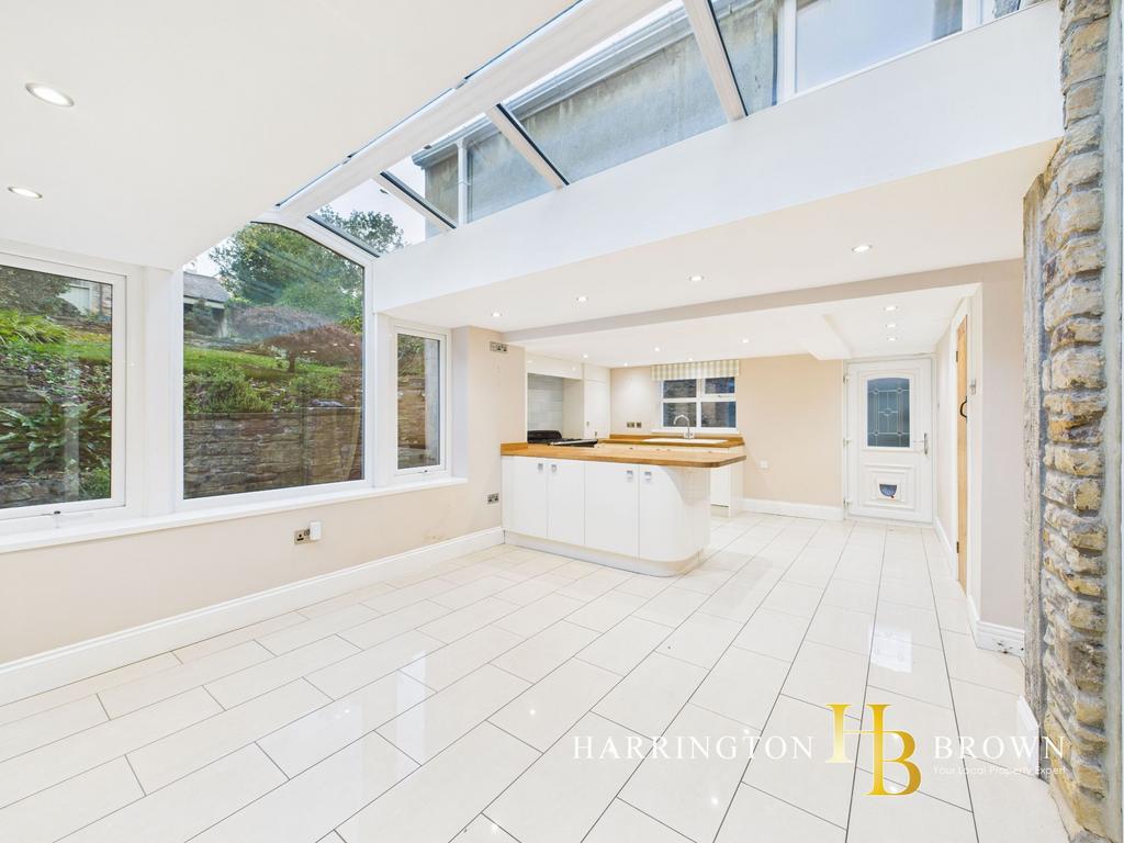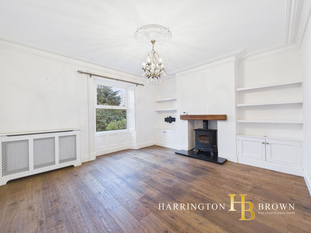 Stepping through the traditional vestibule into the striking hallway, the original balustrade draws the eye upwards as stairs rise to the split-level landing and first floor. To the front of the property lies a beautiful lounge with impressive high ceilings, classical coving and a feature log burner that creates a wonderfully cosy and elegant atmosphere, perfect for relaxing evenings or entertaining guests. A door from the hallway leads through to the second reception room, an elegant, comfortable space with classic alcove storage. Double doors then open into the dining area, which flows naturally into the kitchen to create a superb open-plan arrangement. The dining space is a particular highlight, featuring a stunning glazed A-frame with a skylight that fills the area with soft natural light. The kitchen is well-appointed with a breakfast bar, gas range, integrated dishwasher and a generous understairs cupboard that serves as an excellent pantry.