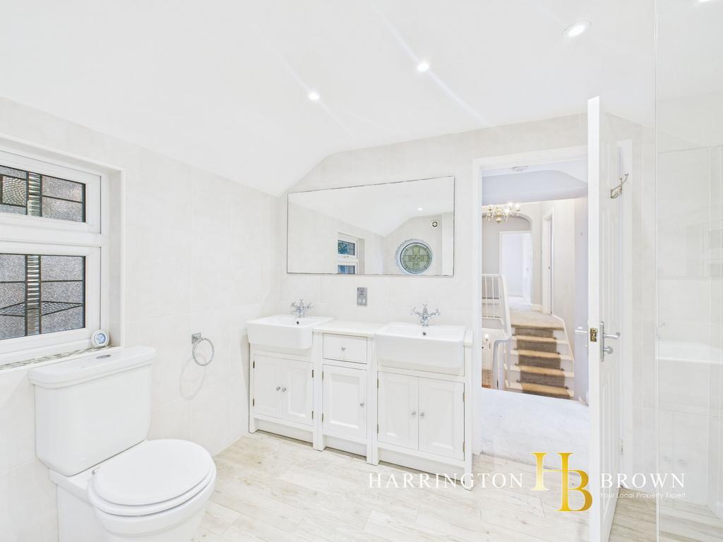 On the split-level landing sits the beautifully finished bathroom, complete with a walk-in wet-room shower, freestanding bath and a his-and-hers vanity with twin basins, all centred around a striking circular oculus window that creates a wonderful focal point. A large storage cupboard just outside the bathroom houses the gas combination boiler, which was installed approximately two to three years ago.