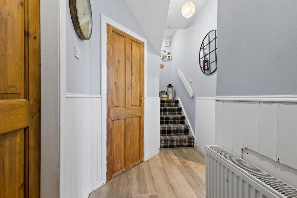 1.28m x 3.17m (4' 2" x 10' 5") Hallway offering contemporary neutral decor, laminate flooring, tartan carpeted stair case, under stair storage cupboard and gives door access to the living room and kitchen.