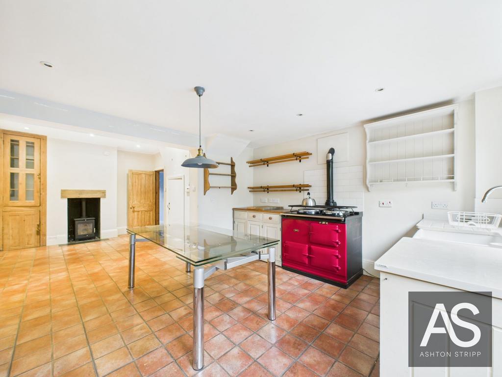 Entering the property, you arrive in the bright and inviting front living room, where a charming bay window allows plenty of natural light to fill the space. From here, you move through to the generous kitchen/diner, which features a cosy log burner, beige tiled flooring and a range of white cupboards and drawers topped with a white marble-effect work surface. The AGA adds a traditional, characterful touch, while a useful storage cupboard provides practicality, and a stable door opens directly out to the garden for easy access.