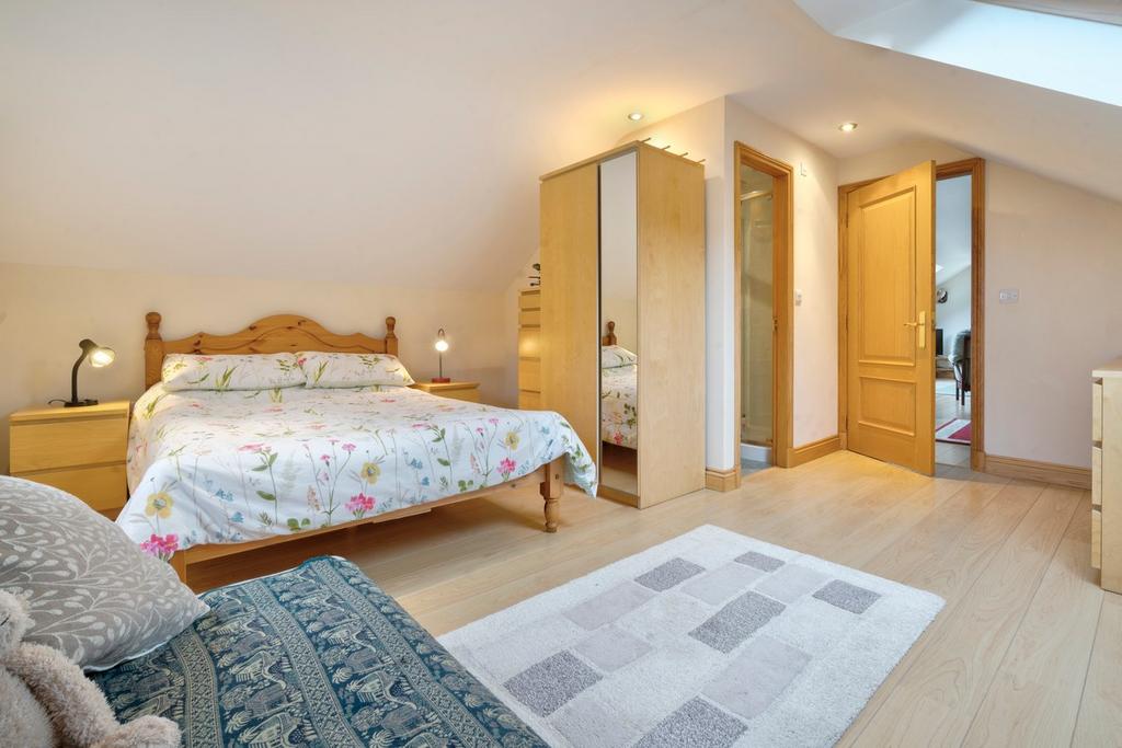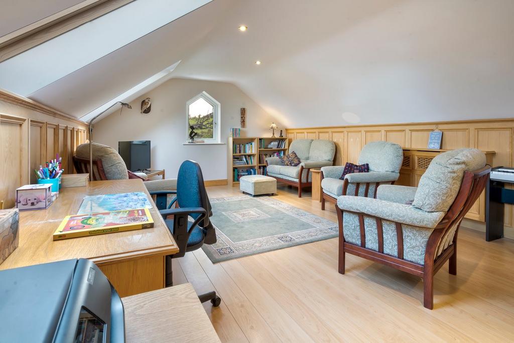 The beautiful staircase leaves the entrance hall and takes you to a fabulous large room that can be used in many ways as a study, sitting room or could make a fourth bedroom. This room has three Velux windows and a window to the gable end wall with views. Wonderful in size, with lots of natural light flooding in, it is a delight to be in. A door from this room enters bedroom three which is a good size double, dual aspect windows and En-suite. To the lower ground floor is the garage with light and power, this enters workshop one with heating and then to workshop two also with heating and houses the boiler and door to the driveway. This space below the main house is fantastic and is extremely versatile in its use. The gardens is a haven for wildlife and wrap around the sides and rear of the property.