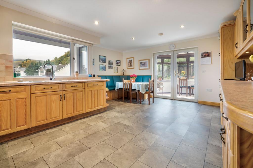 Great space for entertaining. Full range of wall, drawer and base units with contrasting work tops and tile splashback. One and a half bowl sink and drainer. Integrated double oven with grill, microwave, electric hob with extractor above. Integrated washing machine, dishwasher, fridge and freezer. Large window looking to Latrigg, Skiddaw and Dodd fell. Recess lighting. Radiator. Corner seating booth with table and further chairs. Patio doors to:
