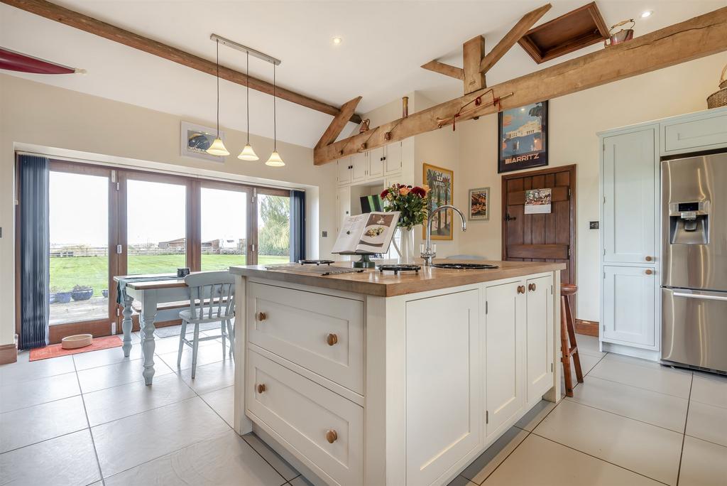 Turning left from here, you enter a stunning kitchen-breakfast room, with exposed ceiling beams, and bi-fold doors leading outside to a patio area, offering incredible countryside views over rolling green fields.