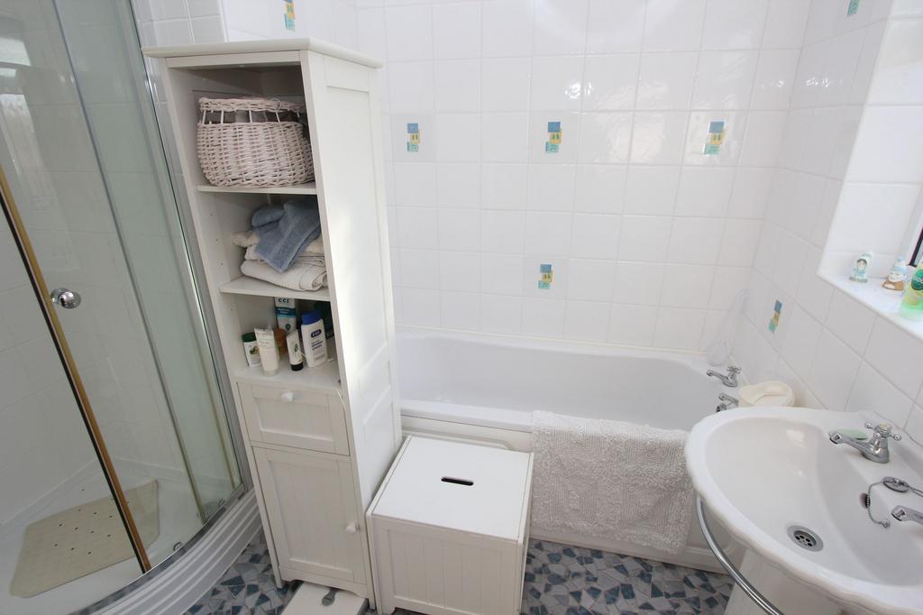 Shower enclosure with electric mixer shower. Panelled bath. pedestal wash hand basin. Low level WC. Radiator. UPVC opaque windows.