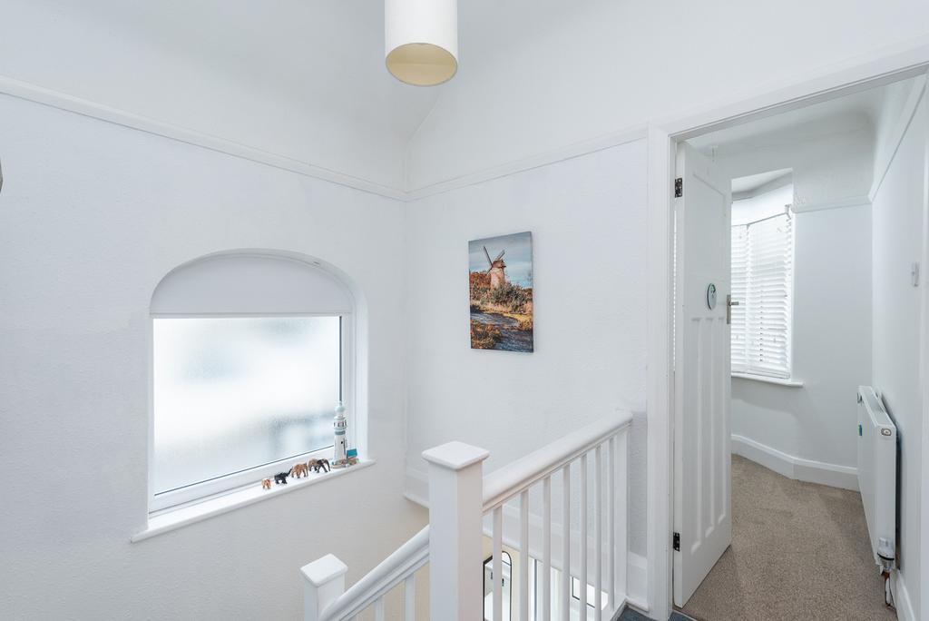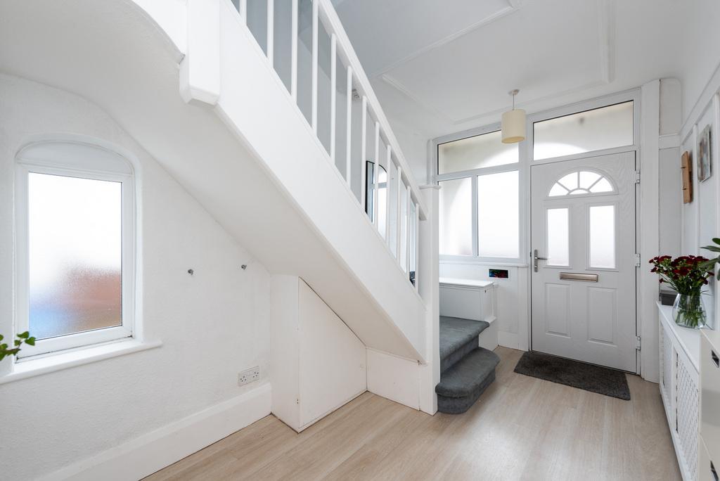 A light and spacious hallway with windows to front and side aspect, wood effect laminate flooring, storage cupboard, and stairs leading to the first floor