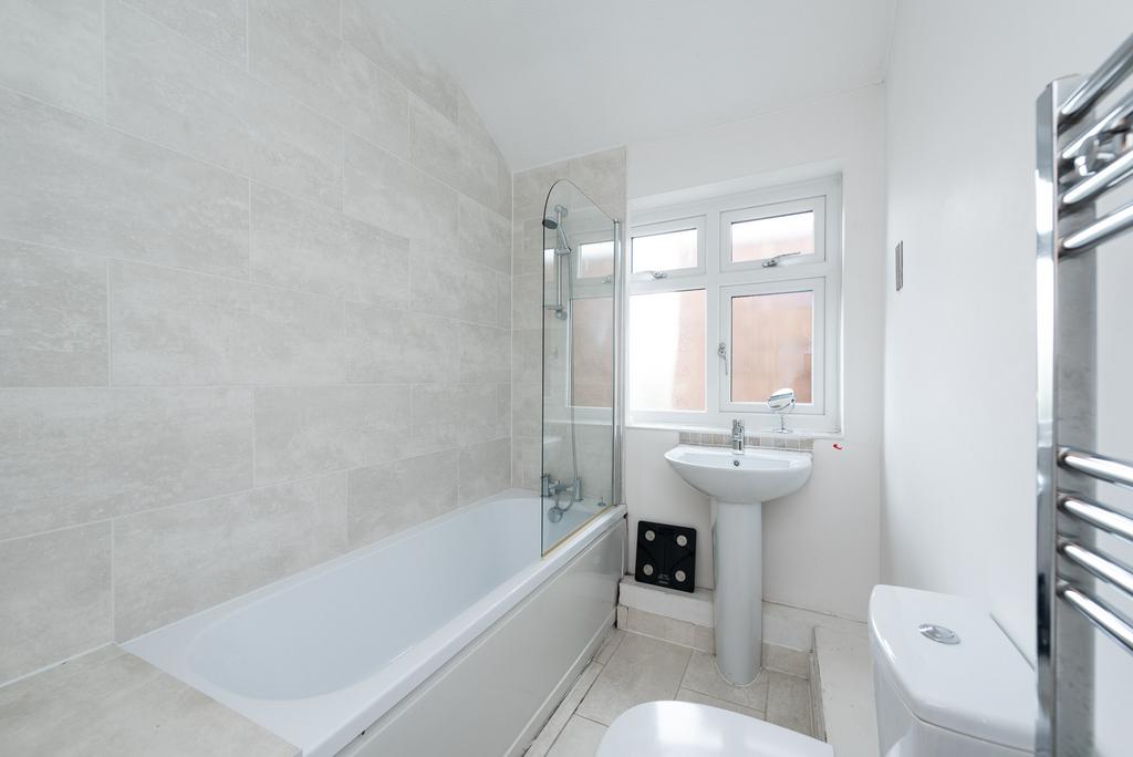 Three piece suite comprising panelled bath with shower over, low level WC and wash hand basin, partially tiled walls, tiled flooring, storage cupboard and window to rear aspect