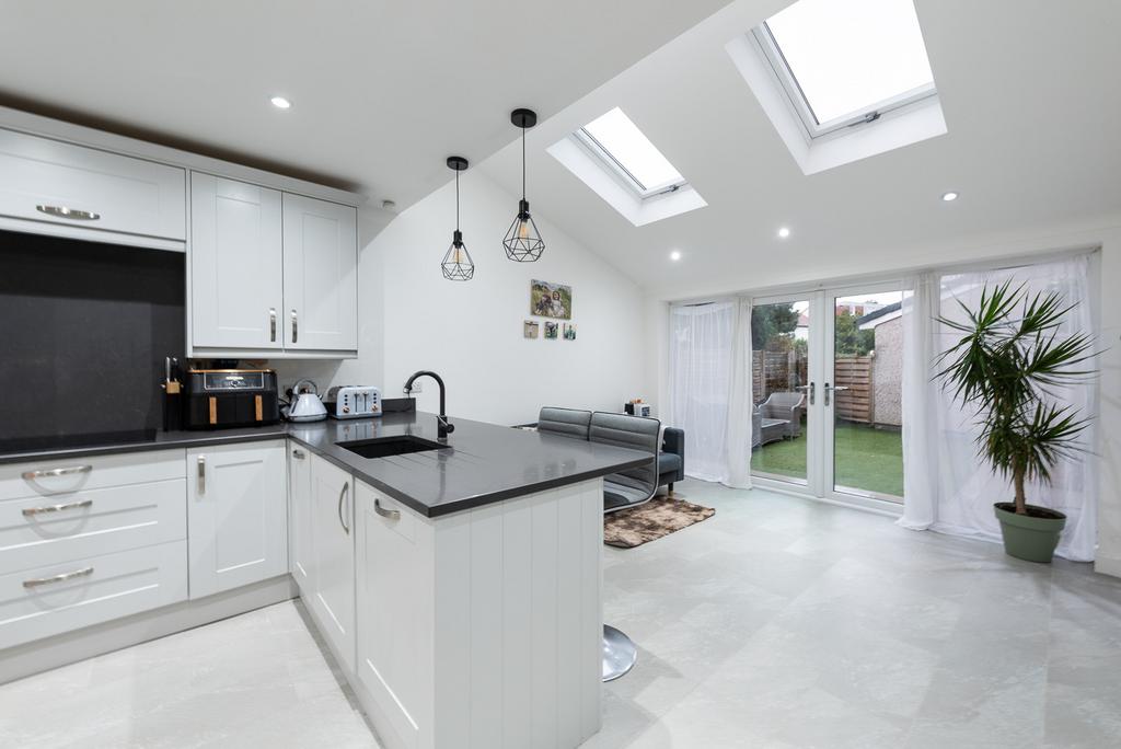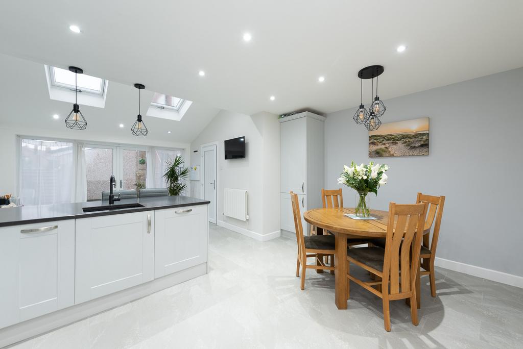 The heart of the home and this one doesn't disappoint with a stylish range of modern wall and base units with Quartz worktop over incorporating a breakfast bar area and inset sink with drainer and mixer tap over, integrated fridge, dishwasher, oven, microwave, and induction hob with extractor over, space for table and chairs, tile effect flooring then leads you into the family seating area with Velux roof windows and patio doors leading out to the rear garden. This light and spacious room also has access into the garage which is currently being used as a utility and storage room