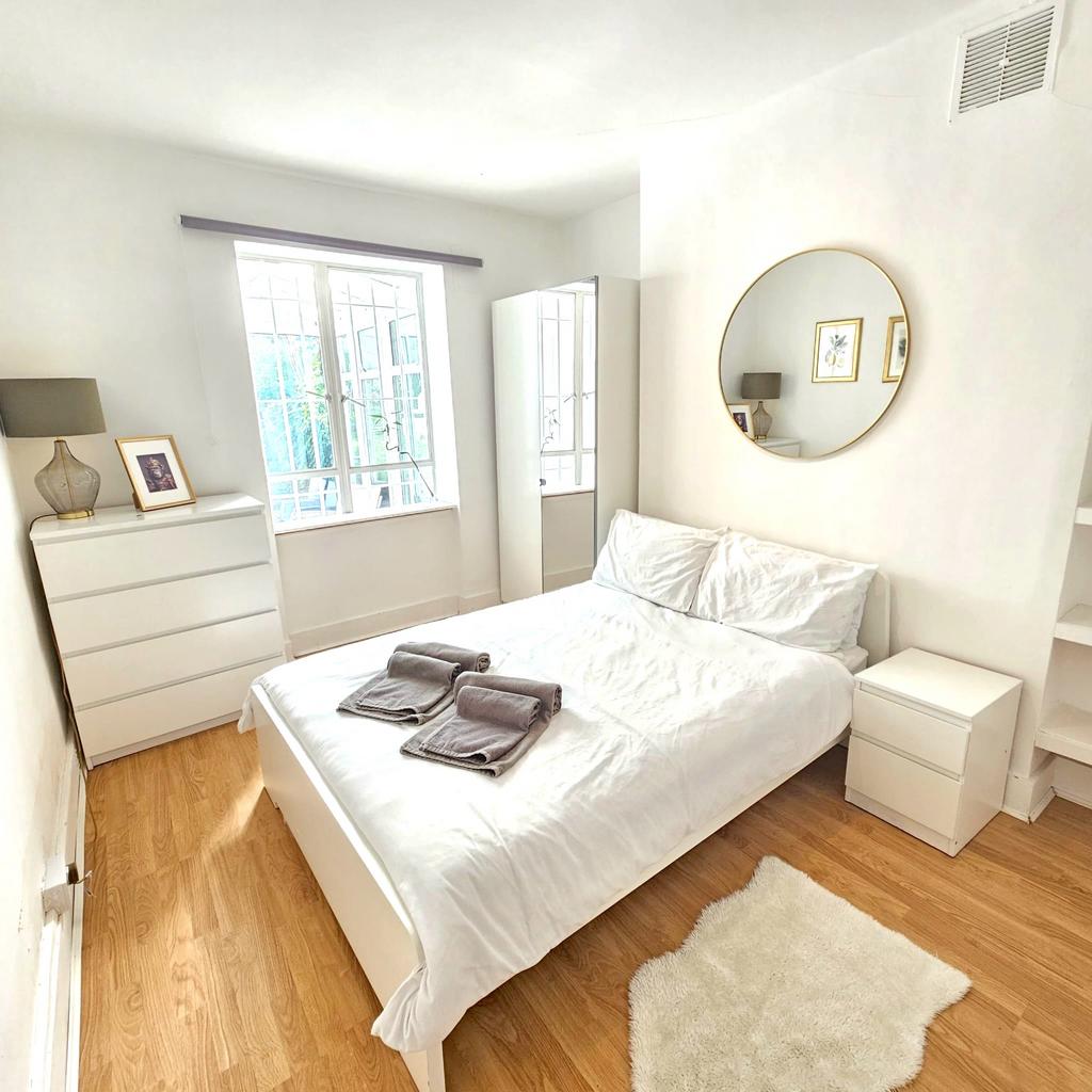 Both bedrooms are spacious doubles with large windows, inviting in streams of natural daylight and offering calming outlooks onto the private rear garden. White walls and wood floors give a crisp, clean feel, while built-in shelving and chest of drawers provide plenty of storage. Thoughtful decorative touches—such as botanical prints, wall mirrors, and bedside lamps—add to the sense of comfort throughout.