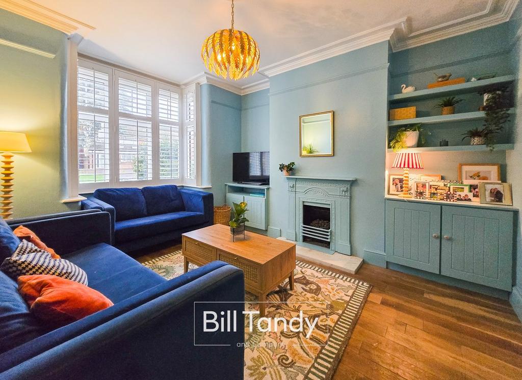4.30m into bay window x 3.50m (14' 1" into bay window x 11' 6") having double glazed square bay window to front, engineered oak floor, high ceiling with coving and picture rail, radiator and cast-iron fireplace set on a marble hearth with storage to either side of the chimney breast.