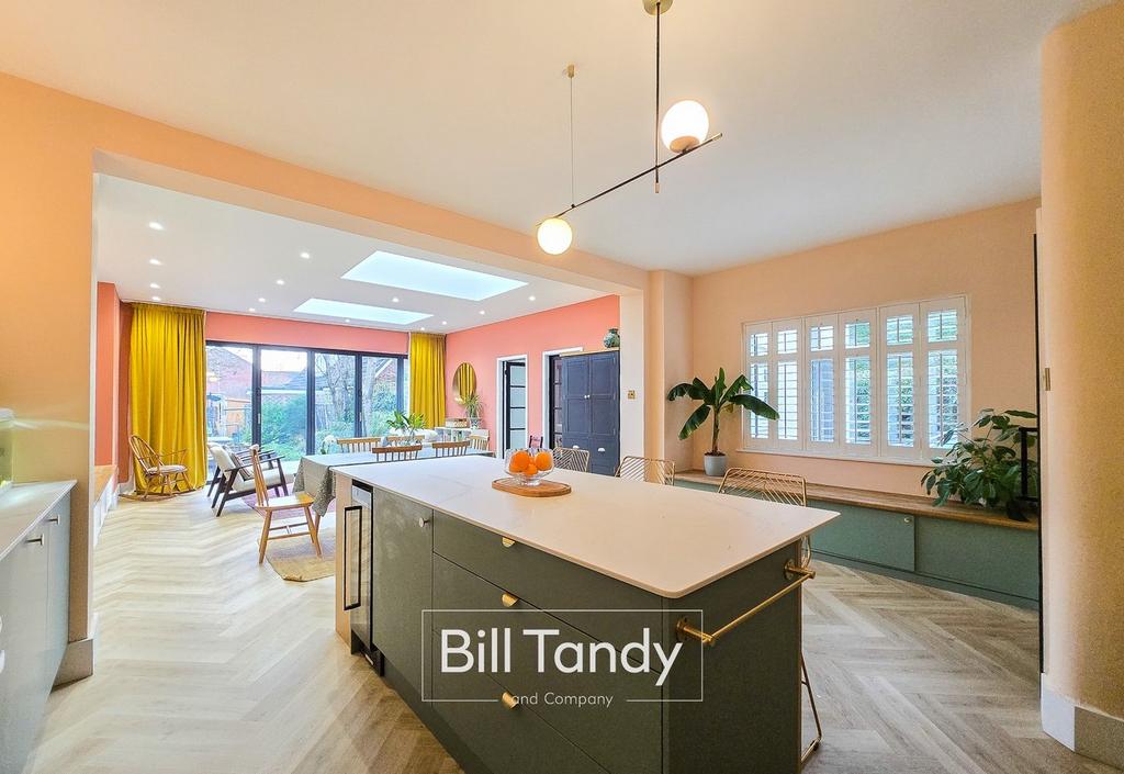 9.80m x 5.52m max (32' 2" x 18' 1" max) one of the distinct features of the property is this stunning open plan and extended space located to the rear of the property offering a home hub with re-fitted kitchen, dining area and sitting area with access to the garden. There is a double glazed window to side, aluminium bi-fold doors opening to the rear garden, herringbone LVT flooring with underfloor heating, ceiling light point and spotlighting and high ceiling. The kitchen area has base cupboards with composite marble style slimline work preparation tops above, tiled splashback surround, inset one and a half bowl stainless steel sink, island with breakfast bar aream base storage cupboard and drawers and wine cooler, integrated fridge/freezer and dishwasher and free-standing Belling multi oven with five ring electric hob.