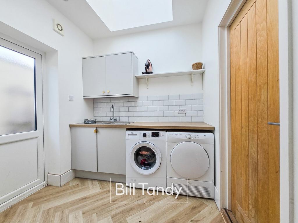 5.32m max x 2.22m (17' 5" max x 7' 3") having ceiling spotlghting, LVT flooring with underfloor heating, obscure double glazed door to rear garden, door to store, base and wall mounted cupboards, preparation work top, inset stainless steel sink with tiled splashback surround, spaces ideal for washing machine and tumble dryer and sliding pocket door opens to: