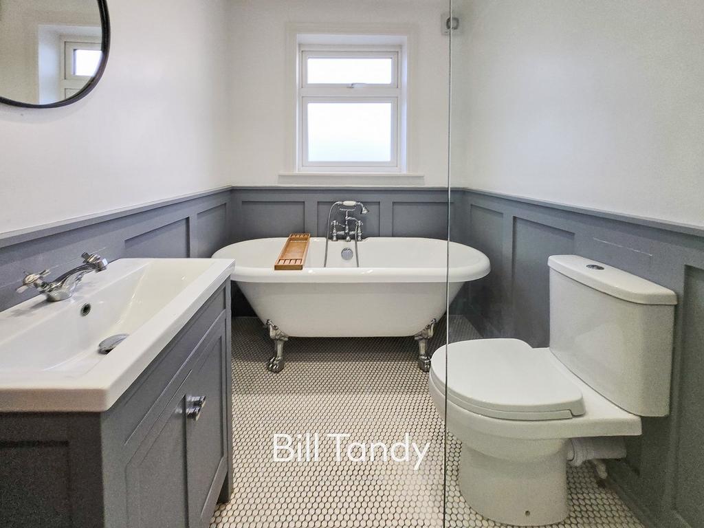 3.06m x 1.80m (10' 0" x 5' 11") having an obscure double glazed window to rear, tiled flooring, wood panelling, spotlighting to ceiling, column radiator with heated towel surround and suite comprising vanity unit with inset wash hand basin, low flush W.C. and twin-ended roll top bath and shower cubicle with twin-headed shower appliance over.