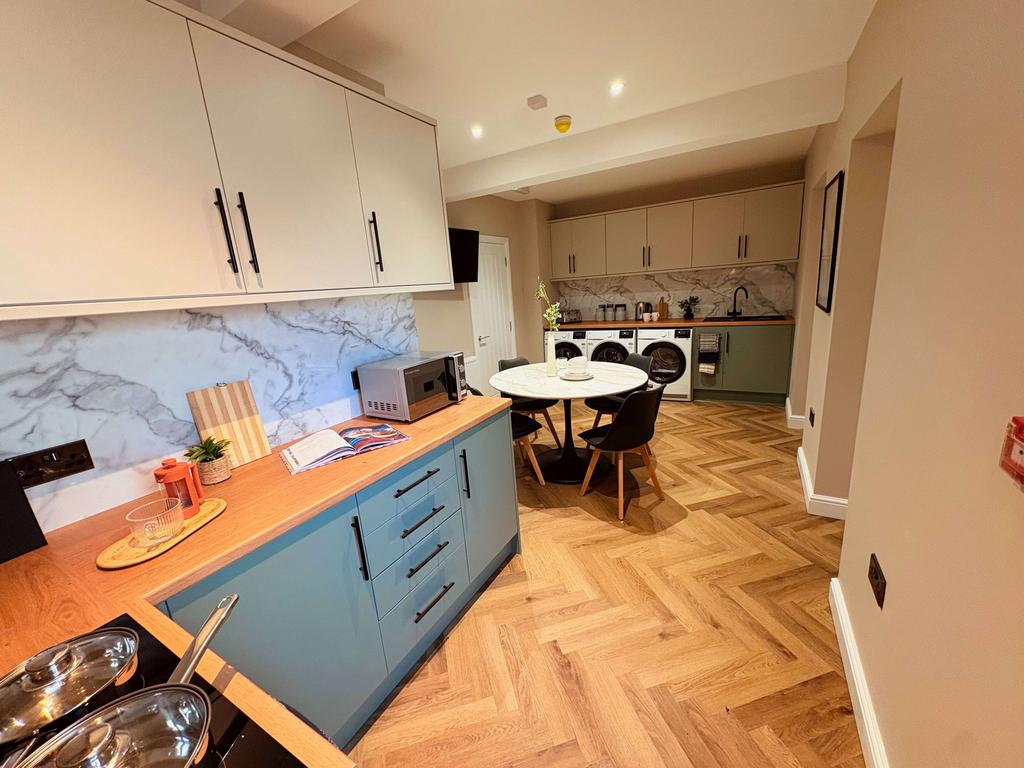 Spacious designer kitchen - loads of worktop space across two prep areas, plenty of storage, and everything you need to cook, eat and relax.