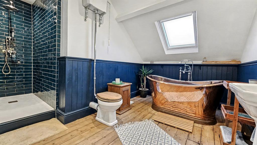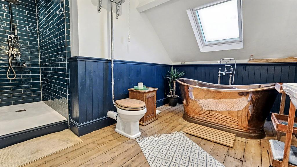 BATH/SHOWER ROOM with wooden floorboards, skylight window, half wood panelled walls, large walk-in fully tiled shower, copper free standing bath, WC, and washbasin with mirror and two lights fittings above.