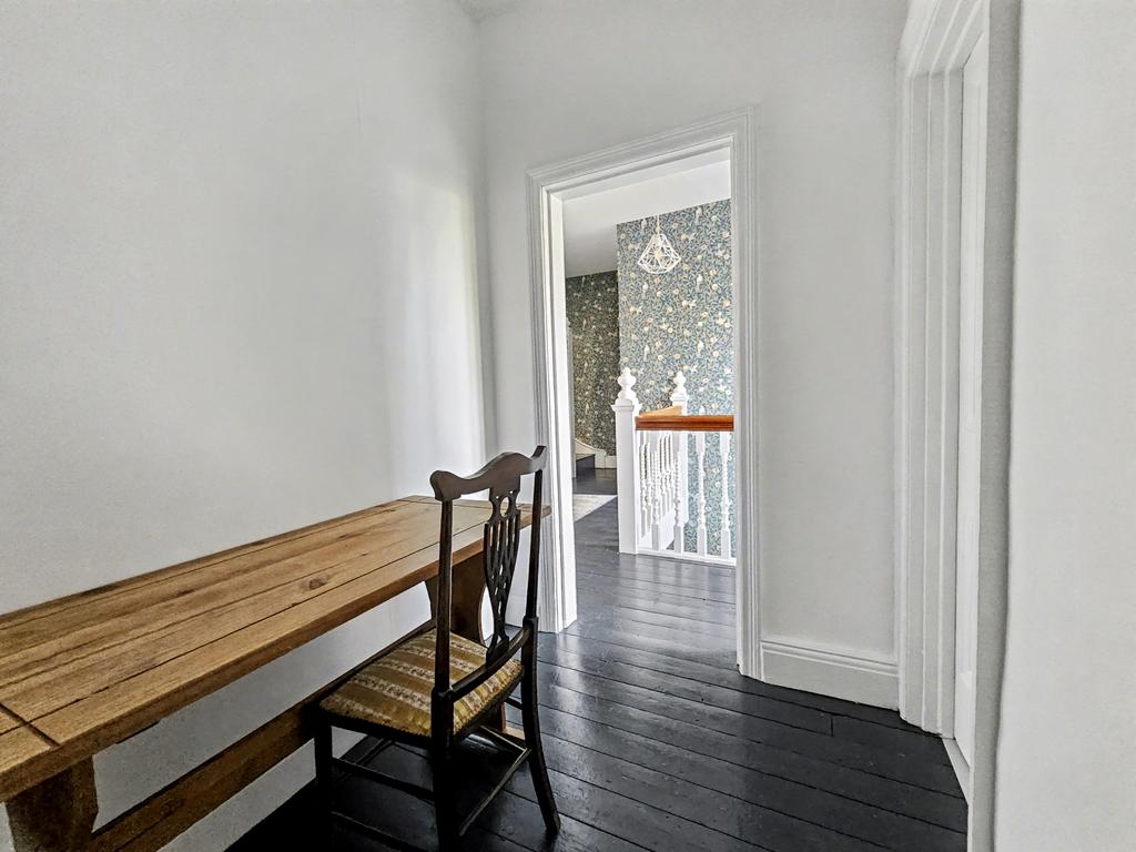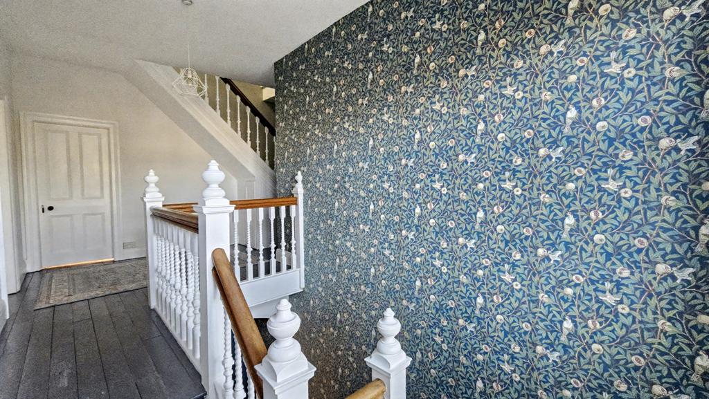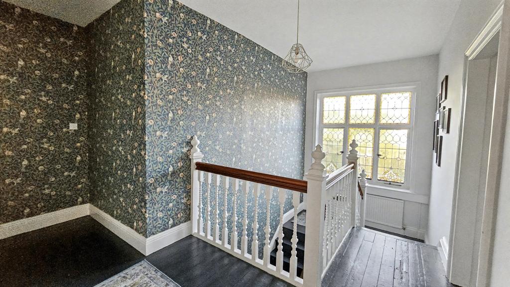 First FLOOR LANDING with wooden floorboards and featuring a fine stained glass window. Two power points.