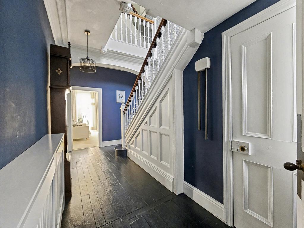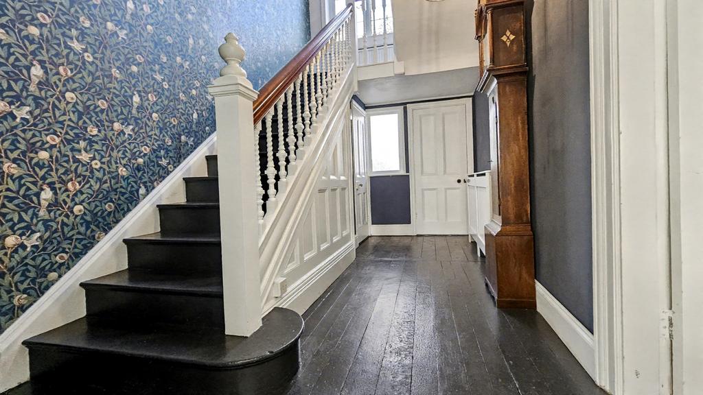 RECEPTION HALL with wooden floorboards, enclosed radiator with shelf over and imposing balustrade STAIRCASE to the first floor.