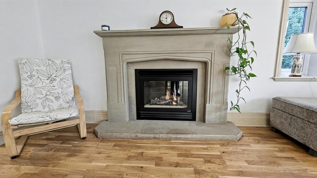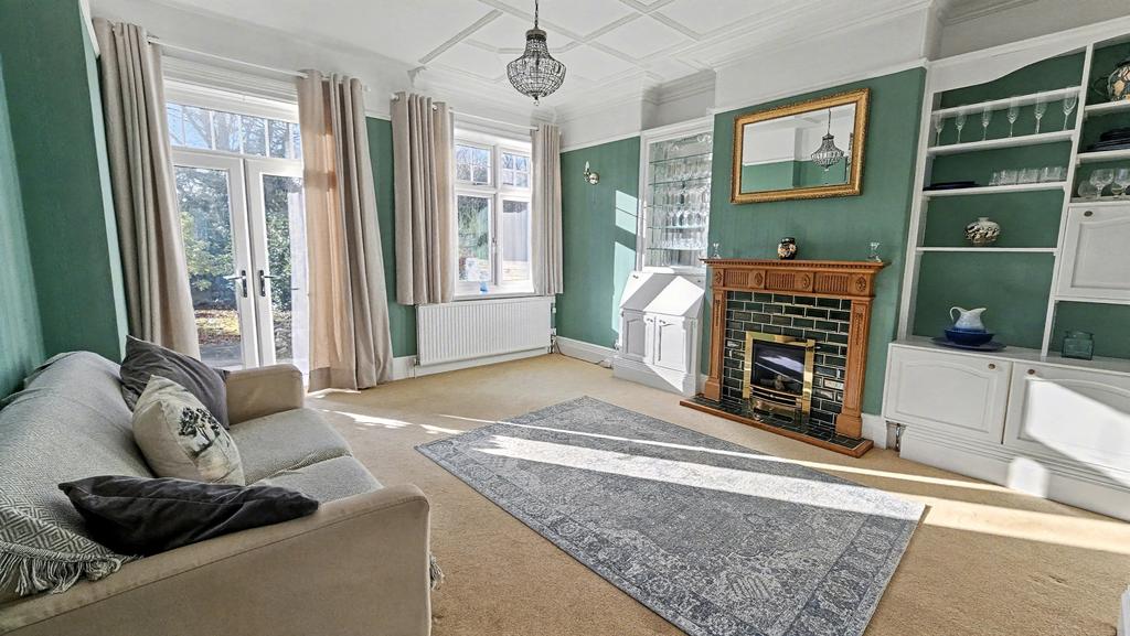 Wood surround fireplace with tiled inset, mantel, hearth, and glass fronted log effect gas fire. Range of recessed shelves, illuminated glazed wall cabinet and bureau style desk with cupboards below and shelves above. Radiator, four power points, two wall lights, and decorative Edwardian ceiling.