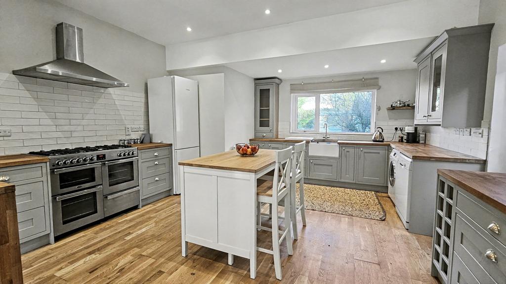 Tall storage pantry cupboard, 'Belling' seven ring gas range with electric ovens below and stainless steel cooker hood over. Breakfast bar and a central island unit, with breakfast bar and wooden worktop. 'Bosch' tall fridge/freezer and spaces for dishwasher and washer. Two windows, ten power points, ceiling spotlights, radiator, and UPVC part glazed door to garden.
