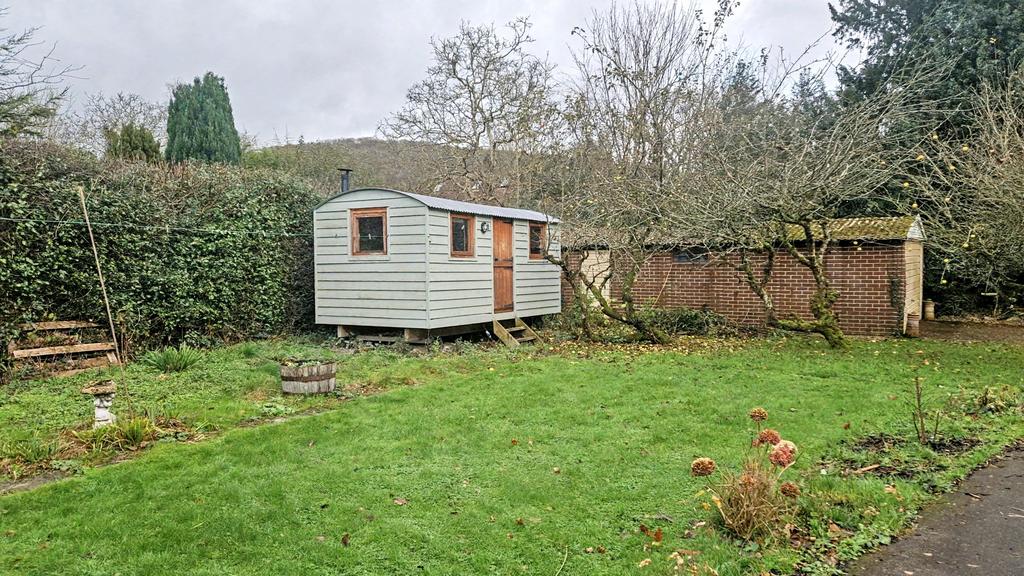 The gardens are a special feature with double wrought iron entrance gates, ample tarmac parking areas, large garage, lawns, satellite dish, veranda, and patio area, established floral beds, a variety of trees, and a useful shepherds hut with a log burner power and lighting-an ideal study or workshop.