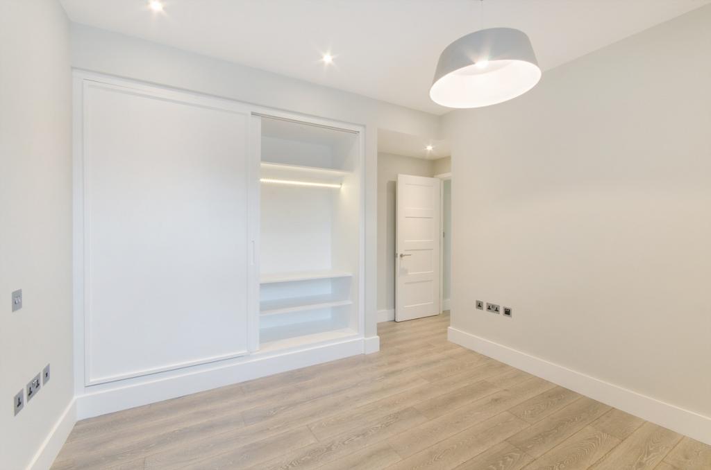 The double bedroom includes extensive built-in wardrobe space for convenient storage, while the stylish bathroom features a large walk-in shower and a chrome heated towel rail.