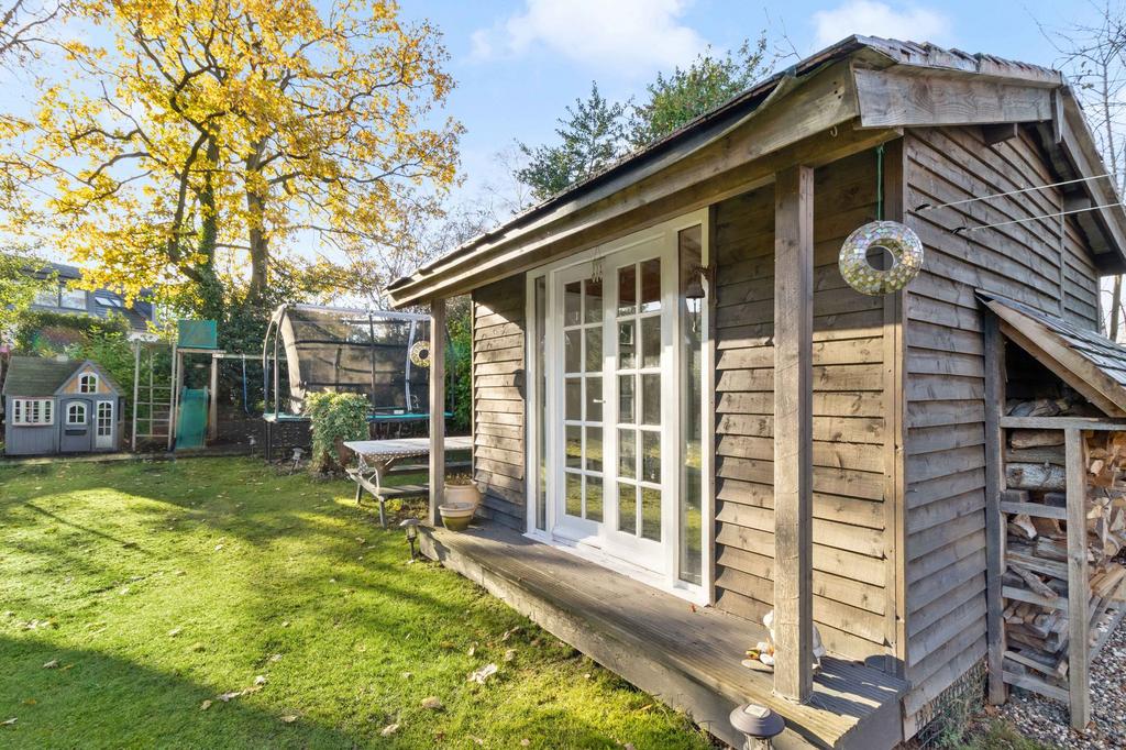 The property is set on a larger than average plot, providing a generous outdoor environment that beautifully complements the internal accommodation. The rear garden enjoys an expansive lawn, framed by a variety of established trees and mature shrubbery that offer both privacy and a picturesque, tranquil setting. Extending from the house is a decked terrace, perfectly positioned for outdoor seating and dining, making it an ideal spot for entertaining or relaxing throughout the warmer months. Within the garden sits a charming wooden summer house, offering excellent versatility as a hobby room, creative studio, or additional entertaining space. At the front of the property, a brick paved driveway provides ample off street parking for multiple vehicles, ensuring convenience for both residents and visitors. From the driveway, you can also access the integral store room, offering useful additional storage and practicality.