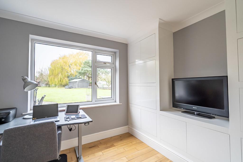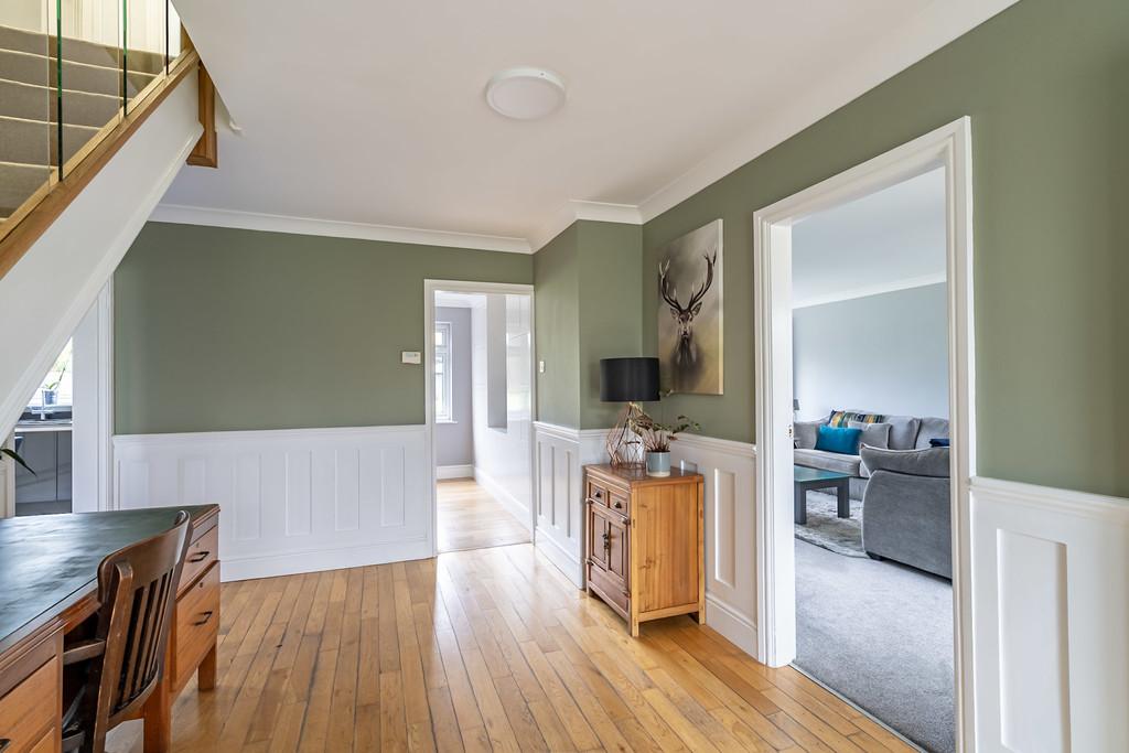 Originally built in the 1980s, the house offers spacious and well-balanced accommodation throughout. Enter through a porch with quarry-style tiles that opens into the sizeable entrance hall featuring wooden flooring and attractive panelled wall detailing. From here step into the dual-aspect sitting room which spans the length of the property, enjoying open views to both the front and rear, and includes a focal gas fireplace. There is also a versatile office/snug with views over the rear garden.