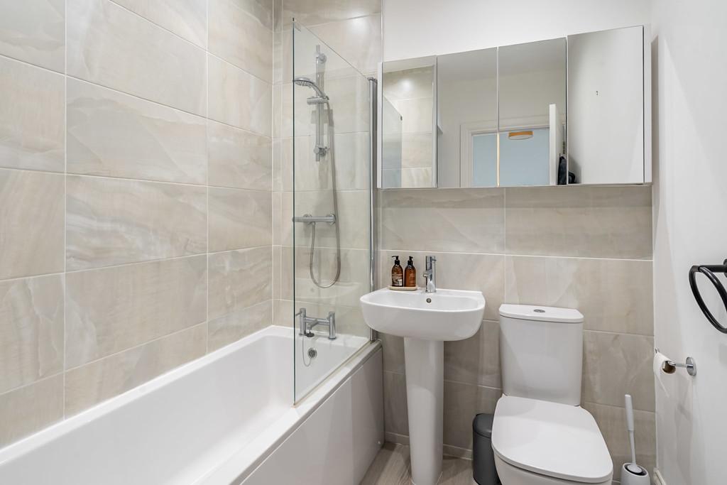 BATHROOM White suite comprising bath with shower over, WC and basin. Part tiled walls, recessed ceiling spotlights, chrome ladder style towel radiator.