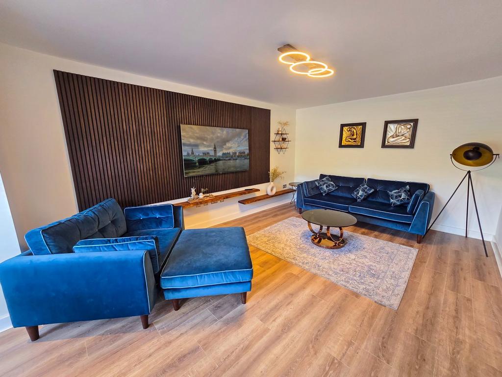 Step inside to an elegant hallway leading to a spacious main lounge. Here, French doors open onto a generous rear garden, perfect for relaxing or entertaining outdoors. The open-plan kitchen and dining area is a true centerpiece, featuring high-end integrated appliances and a cosy adjoining sofa area that can double as a relaxed family or play space. A separate formal living room provides an additional retreat for quieter moments or entertaining guests.