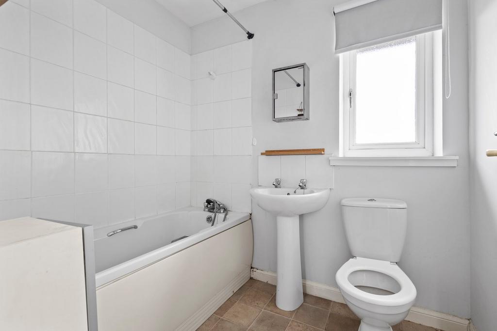 2.05m x 1.78m (6' 9" x 5' 10") Three piece fitted bathroom comprising of WC, wash hand basin, mains shower over bath, half height tiling around the bath, vinyl flooring, double glazed window to the rear.