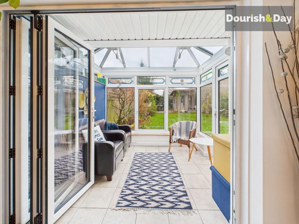 The property is approached by a driveway for two cars and a neat entrance porch that opens into a welcoming hallway with handy under-stairs storage. From here, you can head into the bright and inviting living room, a lovely space with an electric log-burner-style feature fire giving it a cosy focal point. The lounge opens directly into the dining room, creating a seamless flow for everyday living and entertaining. The dining room is full of natural light and features bi-fold doors that lead to the conservatory, which in turn opens straight out to the garden.