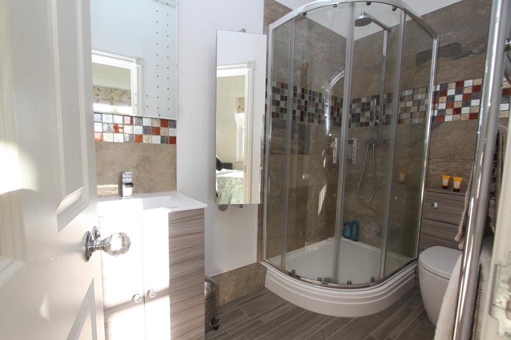 SPACIOUS ENSUITE SHOWER ROOM fitted with matching white suite complemented by part ceramic floor tiling, comprising large walk-in shower cubicle with overhead shower, additional hand set and glazed enclosure, built in vanity unit with wash hand basin having mixer tap with cabinet below and electric shaver point above, close coupled wc with concealed cistern, chrome ladder style heated towel rail, ornate ceiling cornice, extractor fan, inset down lights.