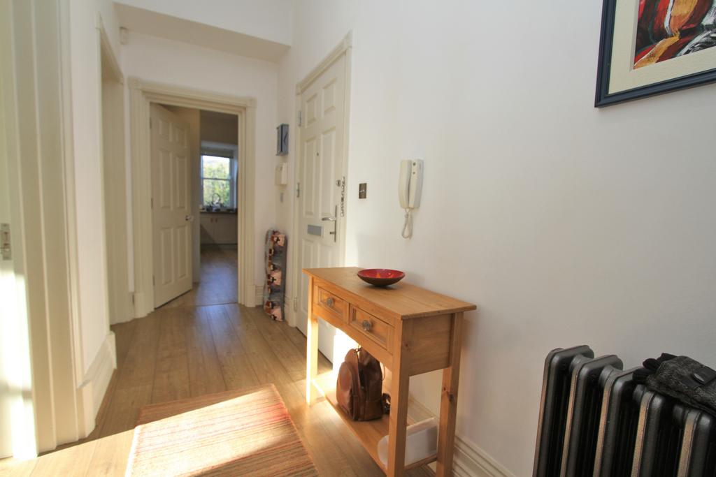 SPACIOUS ENTRANCE HALL with ornate ceiling cornice, inset down lights, entry phone, two period cast iron radiators, built in under-stairs store cupboard.
