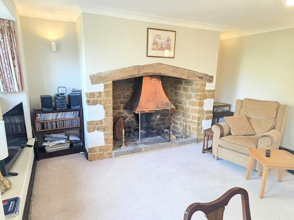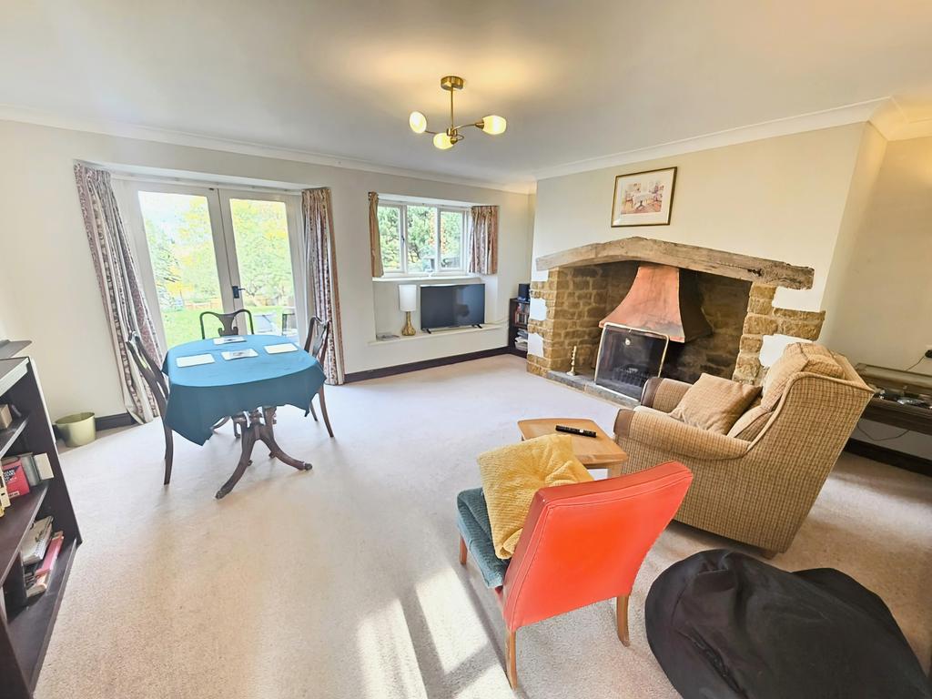 With a feature stone/oak fireplace with an open fire basket on a stone hearth, the room has a window and French doors opening out to the garden. There is a radiator and ceiling lights and a built-in window bench seat. The living room is currently carpeted.