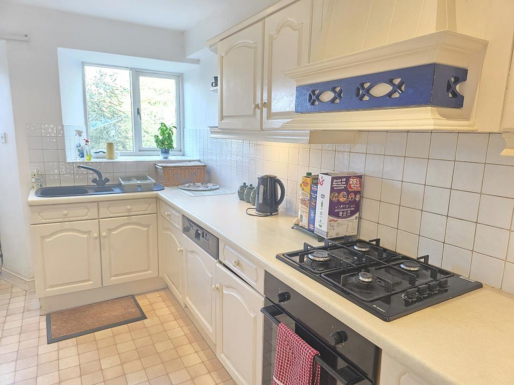 The kitchen is fitted with a range of white floor and wall cupboards with worktops over. There is space for an under-worktop fridge, integrated dishwasher, space for a washing machine. There is a built under oven with gas hob over and integrated extractor hood over, composite sink with mixer taps. The kitchen has a window and door opening to the rear garden, radiator and vinyl flooring.