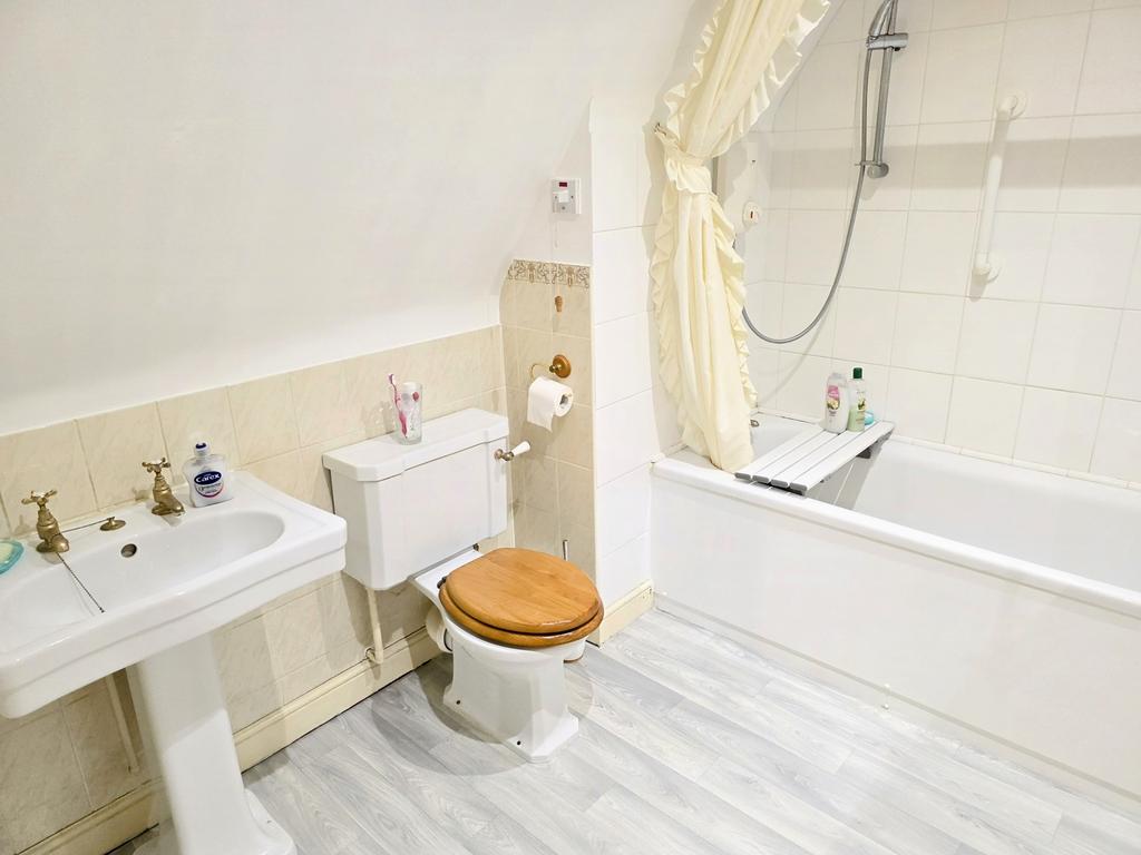 The property has a good-sized bathroom which offers close coupled W.C., basin with pedestal and bath with an electric shower over. The walls around the bath are fully tiled in plain white tiles and the wall behind the W.C. and basin are tiled to half height.
