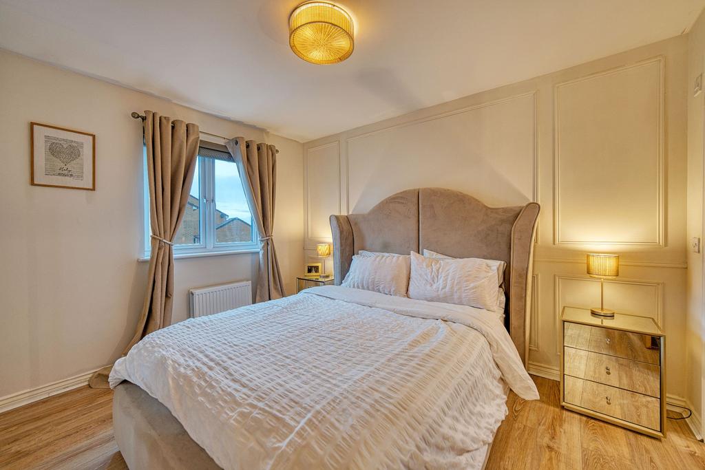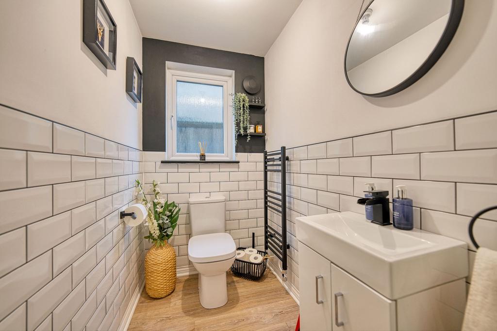 To the front, the home enjoys a neat garden laid with artificial grass and a private driveway. Inside, an extended vestibule opens into a bright hallway finished with modern décor, laminate floor coverings, solid oak doors and woodwork, and an open-plan staircase. A stylish WC sits off the hall, complete with contemporary tiling and matte black finishes. The front of the home features a dedicated study, ideal for home working. A third reception room, created from the garage conversion, offers excellent flexibility as a family room, playroom or additional bedroom.