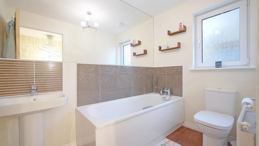 Upstairs, the landing is filled with natural light from a side window and provides access to all rooms, storage cupboard and attic. The principal bedroom features sliding mirrored wardrobes and a private en-suite shower room. Three further bedrooms include two with built-in wardrobes, all presented in fresh, neutral décor. The family bathroom completes the accommodation.