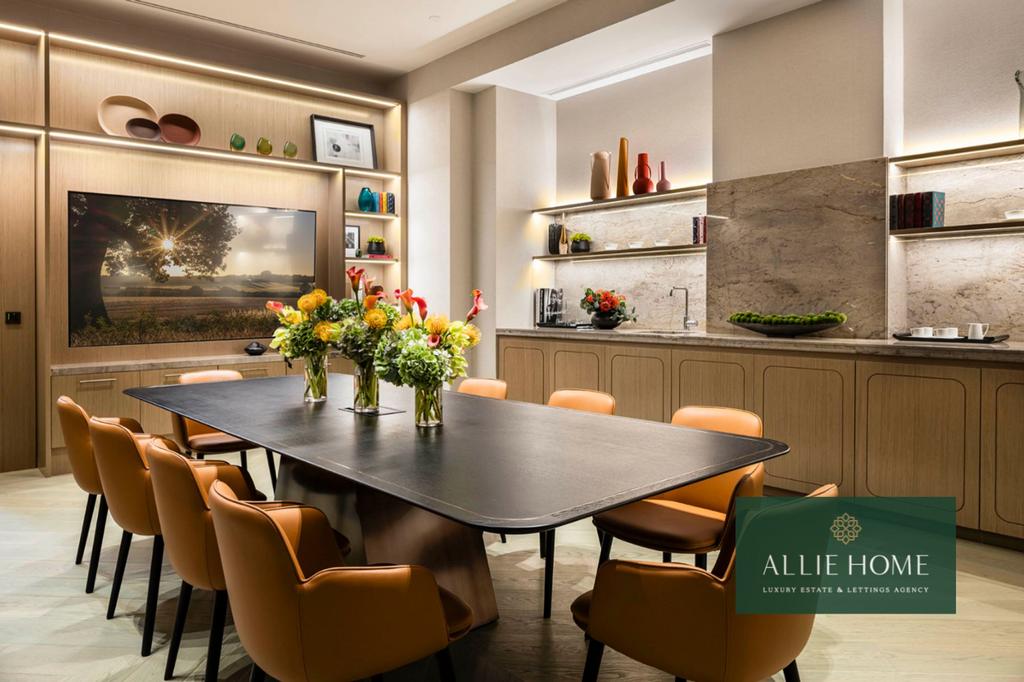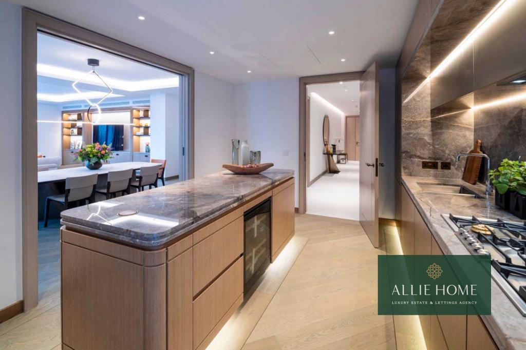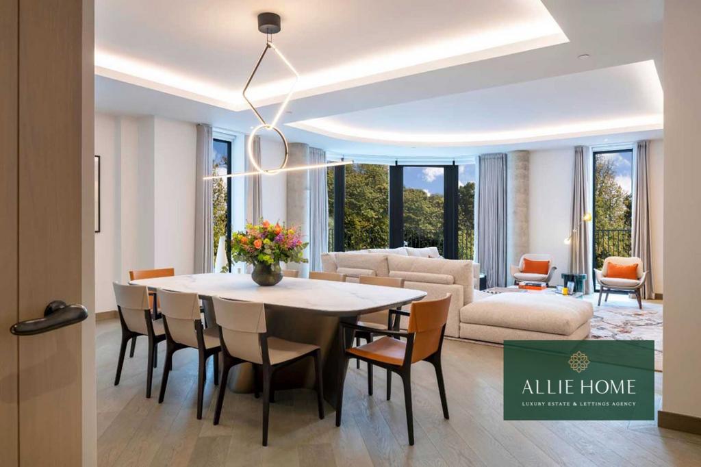 This magnificent 2,437 sq ft three-bedroom, three-bathroom apartment defines modern luxury, offering panoramic views over Hyde Park and Kensington Palace Gardens. Expansive floor-to-ceiling windows flood the space with natural light, enhancing the seamless flow between open-plan living and dining areas. The bespoke kitchen, finished with Gaggenau appliances, premium materials, and elegant craftsmanship, complements the refined interiors and meticulous detailing throughout the home.