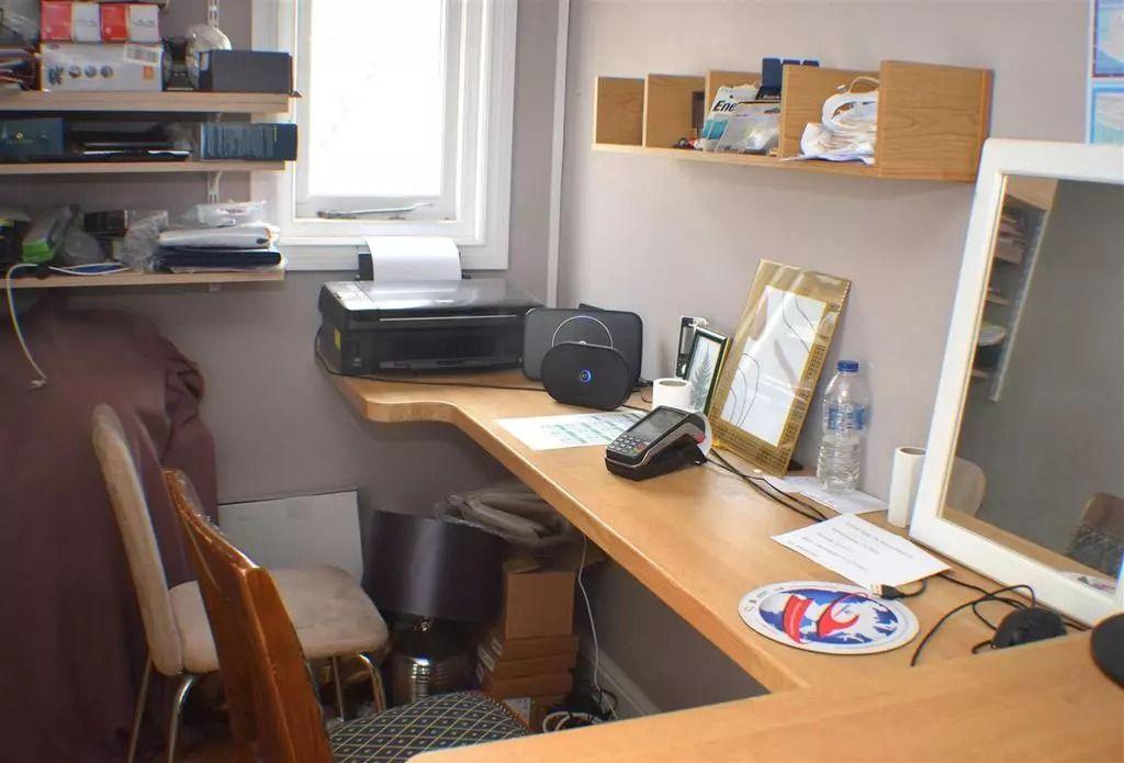 Built-in desk, shelving, CCTV, two windows, wood block flooring