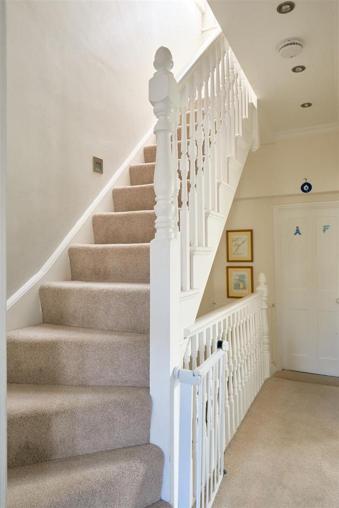The main living room sits at the front of the house. Its green pinstripe wallpaper, bespoke shelving and original fireplace give the space a calm, characterful feel. Generous windows draw in afternoon light, while clever storage and built-in bookcases make the room easy to live in.