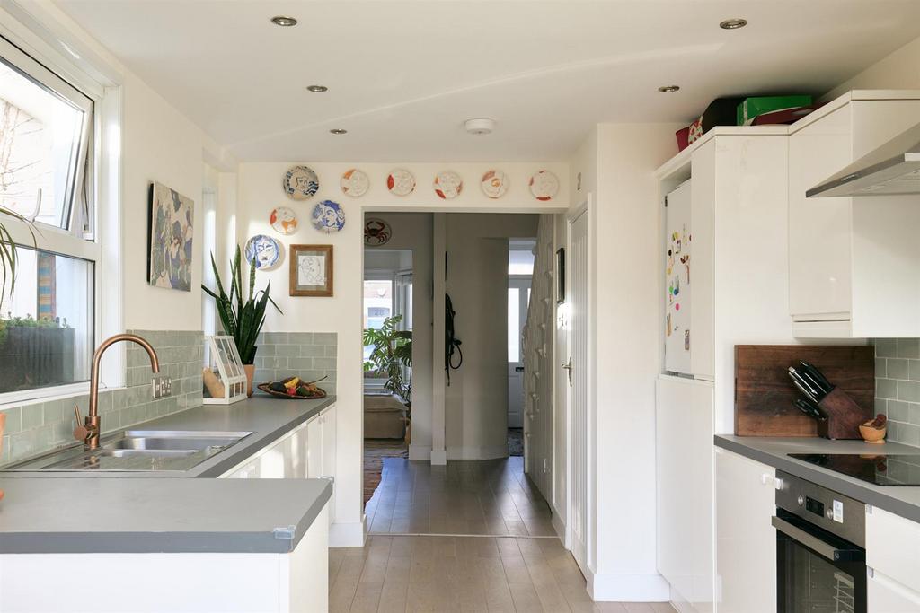 At the rear is a bright open-plan kitchen and dining space, finished with sleek cabinetry, skylights and garden views. The layout creates a natural hub for everyday life, opening through wide doors to a beautifully kept garden with a low-maintenance moss lawn and a smart home office or studio at the far end.