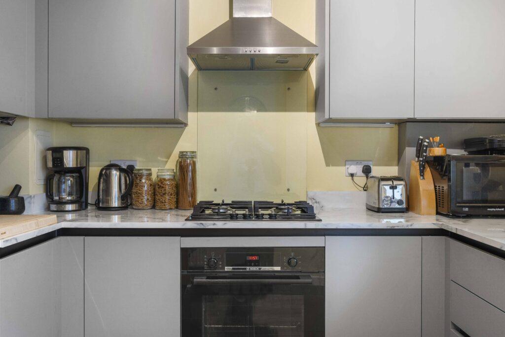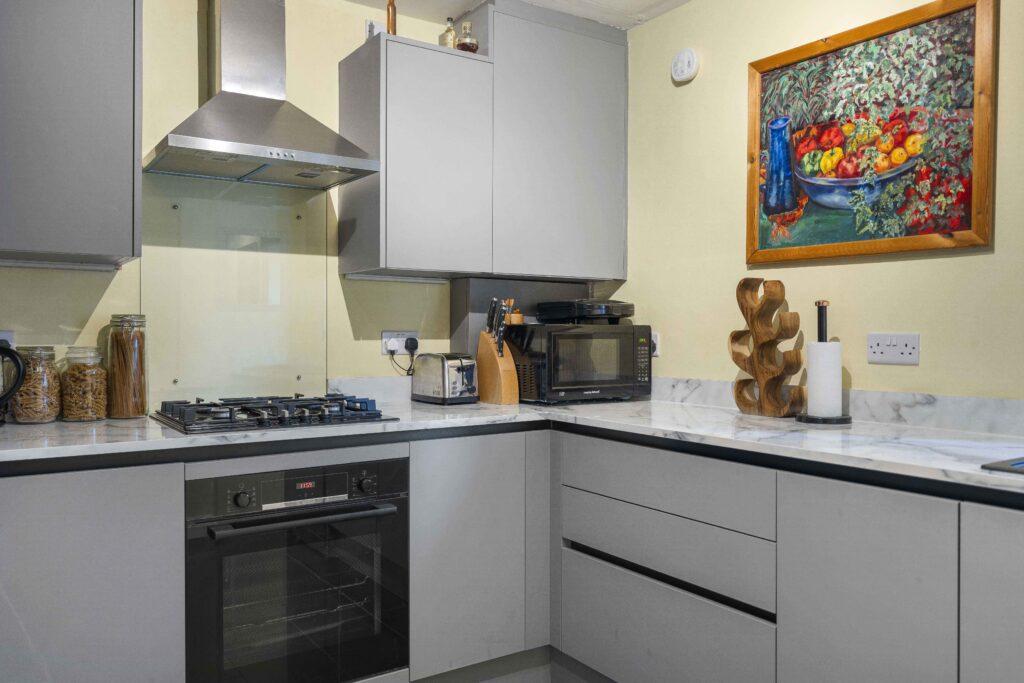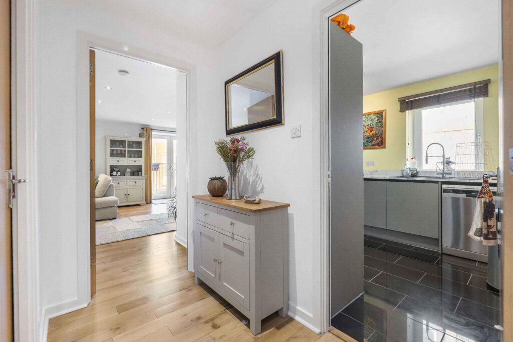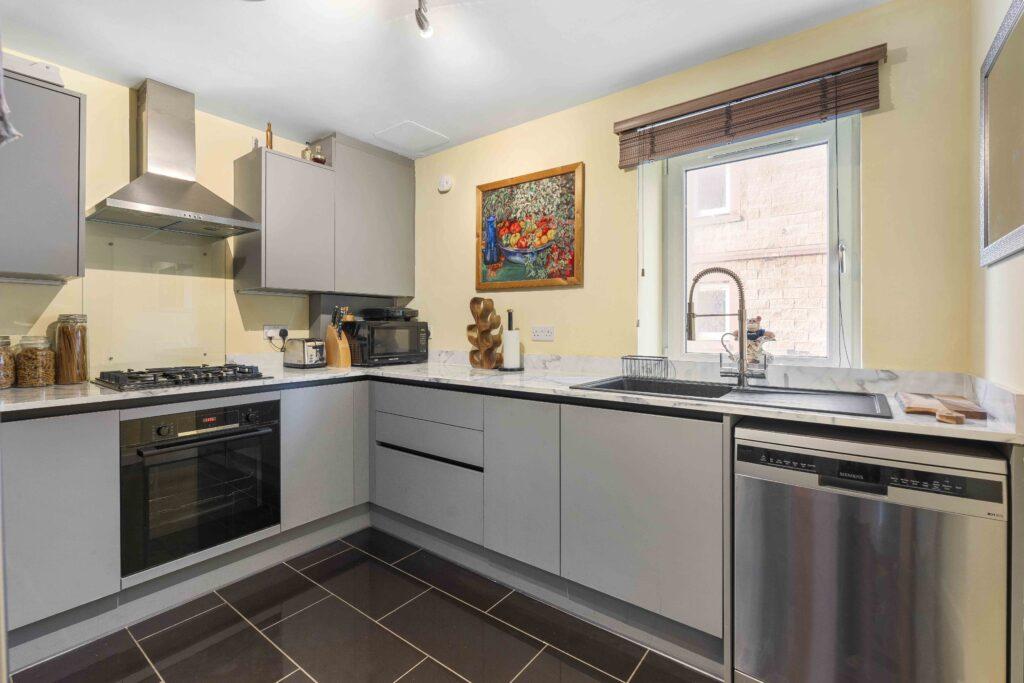 The well-designed kitchen is conveniently located off the hall and features modern units with ample worktop space.