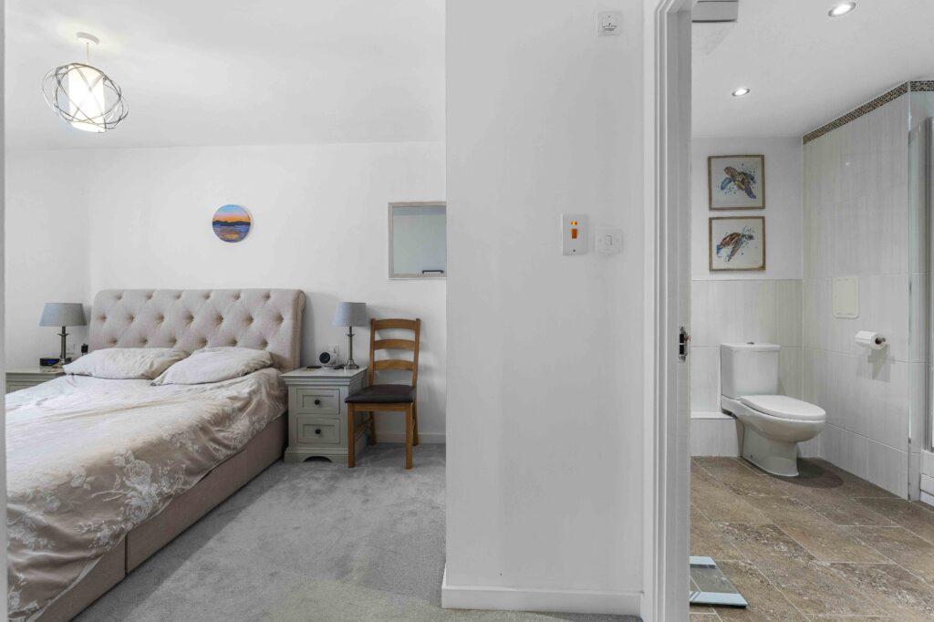 The principal bedroom is a comfortable and inviting space, complete with fitted wardrobes and direct access to a stylish ensuite shower room.